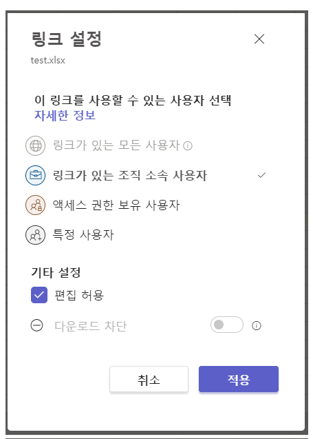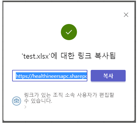 3. 링크 복사->링크가 있는 조직 소속 사용자 선택->편집 허용 체크->적용